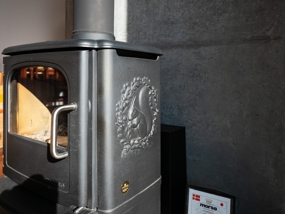 右手に進むと、すぐに奥行きのあるLDK。コンクリート壁の裏側には、なんと薪ストーブが。これまた意外な組み合わせ。側面にかわいらしいリスのマークが入ったデンマーク・モルソー社の薪ストーブです。キュービックなデザインもしゃれています。