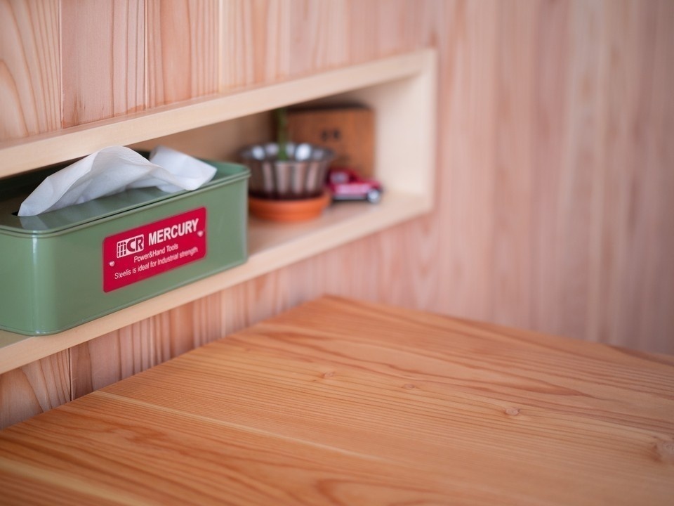 キッチンは既製品にカウンター収納を造作して使いやすくしました。また、食品庫もあるため野菜やお米の保存も冷蔵庫を使わずにできます。