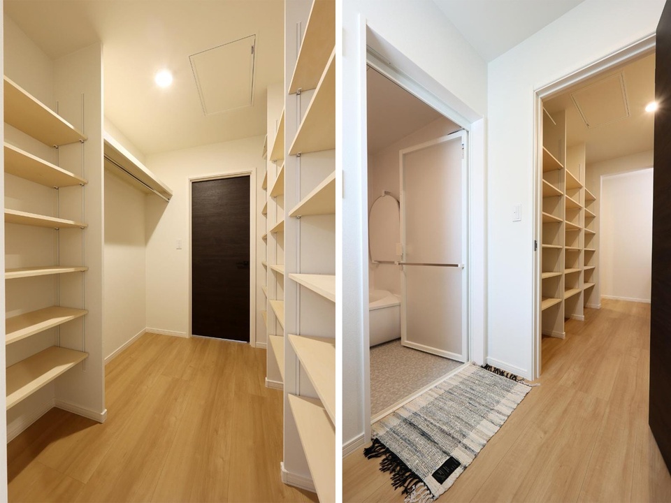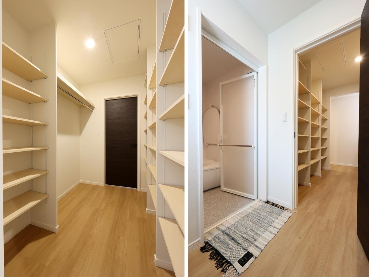 (左)ウォークインクローゼットにはハンガーポールと壁一面に棚を造作。家族全員の衣類がしまえます。(右)その先には、脱衣室と浴室があります。入浴時の着替えなどを取り出しやすい配置です。