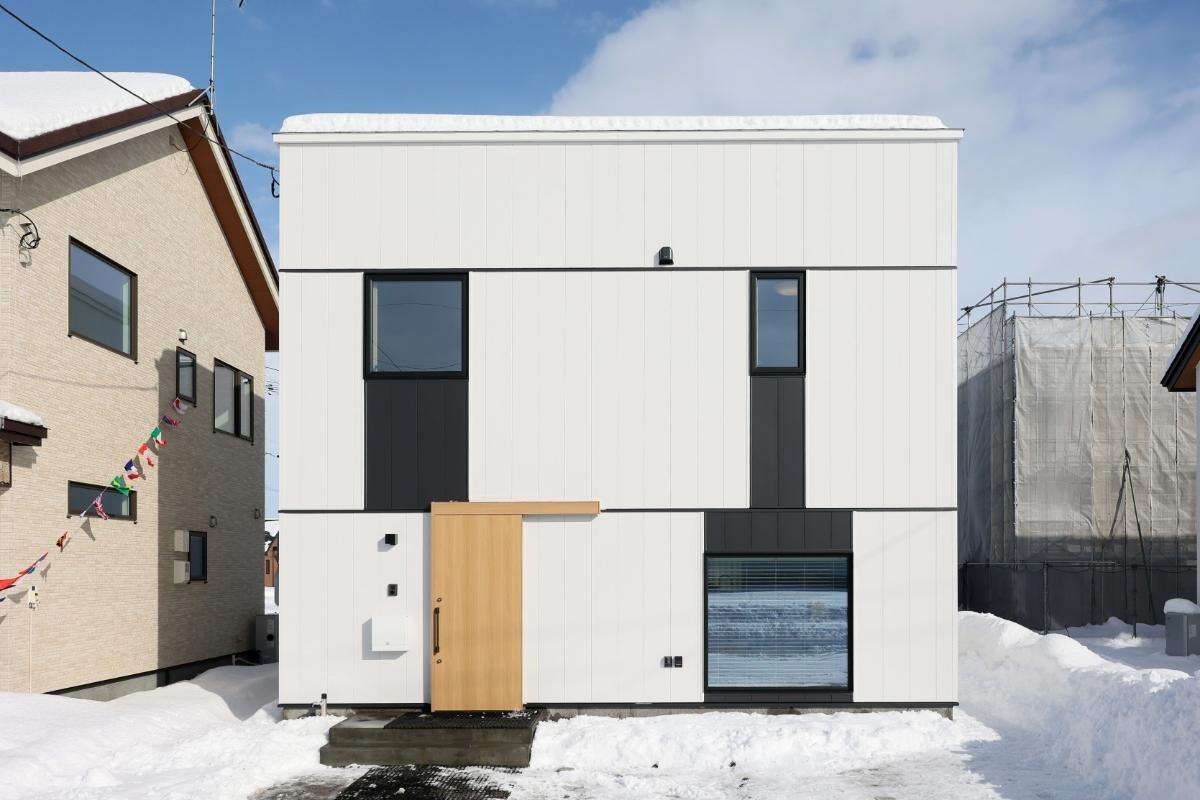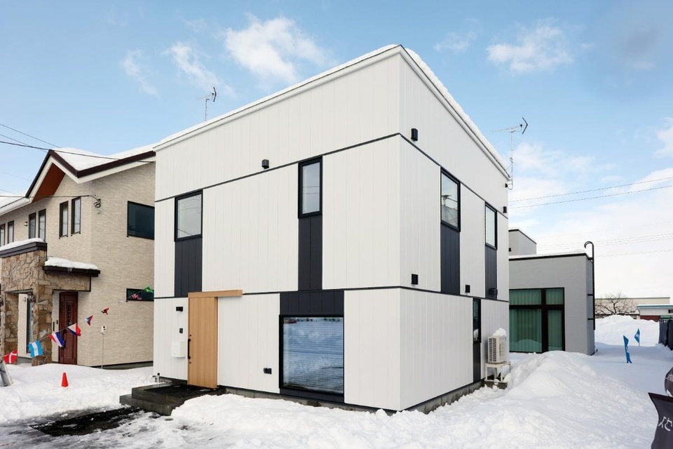 モデルハウスは千歳市あずさ西エリアの大規模分譲地「スカイタウンⅡ・煌めきの街」の一角にあります。ホワイトのガルバリウムを基調に窓枠上下のブラック、玄関引き戸の木目がアクセントのスタイリッシュな外観です。