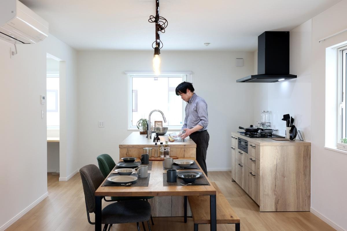 アイランドキッチンはセパレートタイプ(Ⅱ型)で調理も回遊もしやすいプランです。