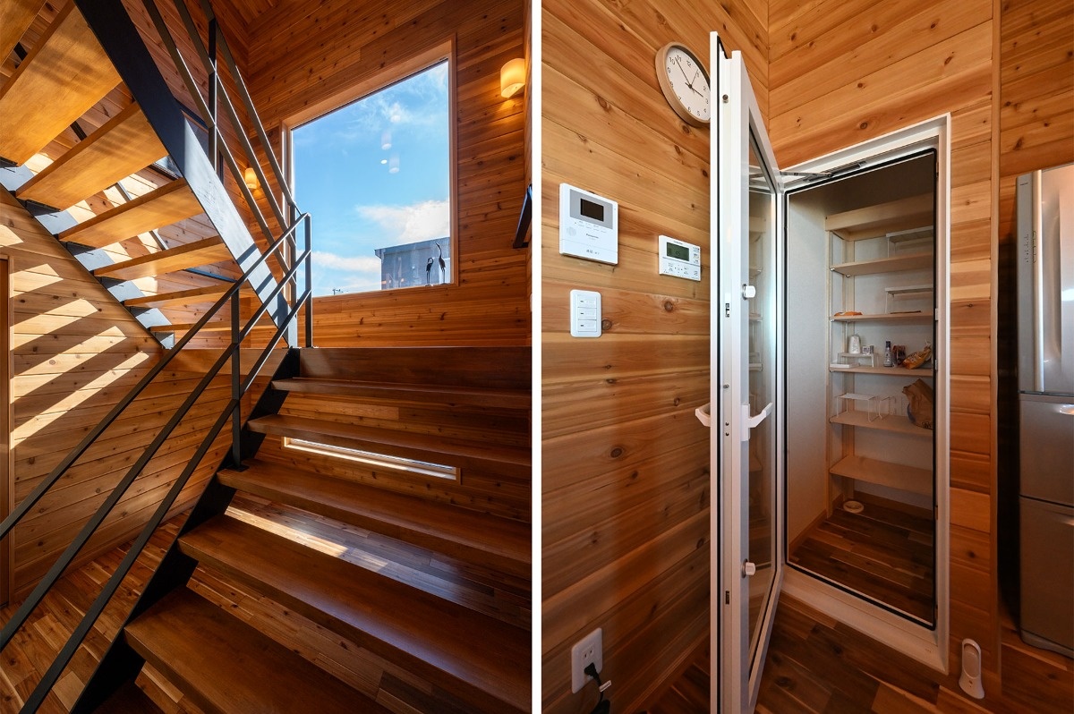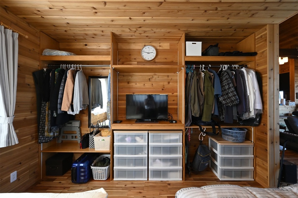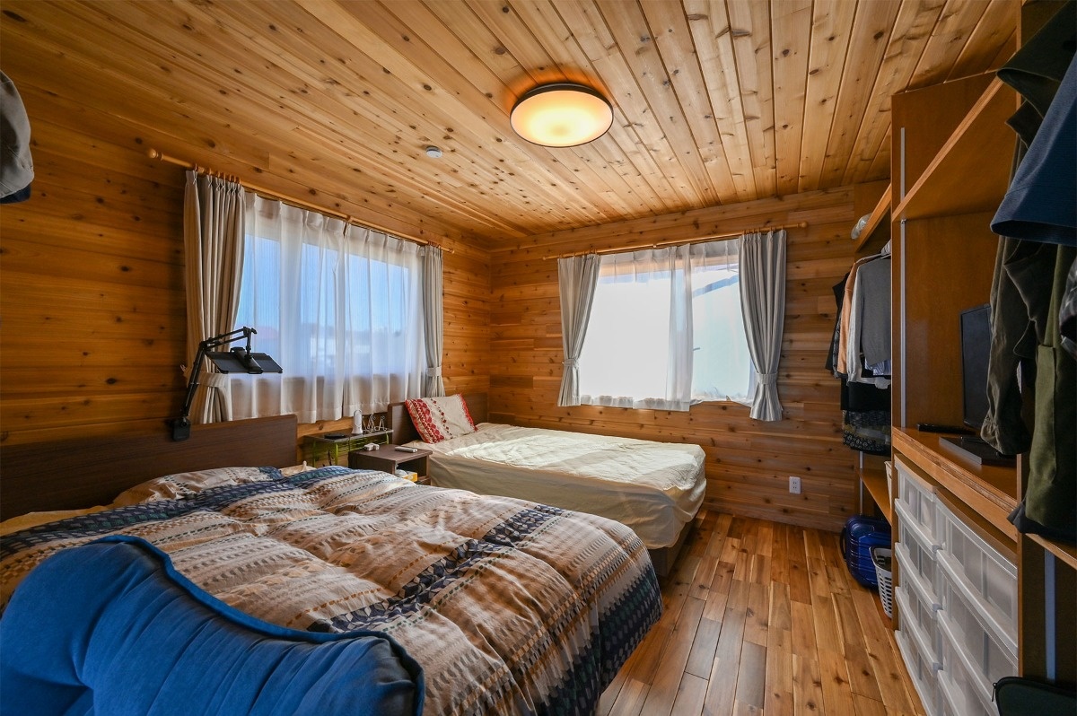 リビング・ダイニングから続く寝室も、同じく木の温もりに満ちた空間。120cm幅で3列に造作したオープンクローゼットの使い勝手が良いのも大きなポイントで、同じくキッチンにある食品庫も外気を入れて低温に保つことができるなど、滞在時にはとても重宝していると言います。