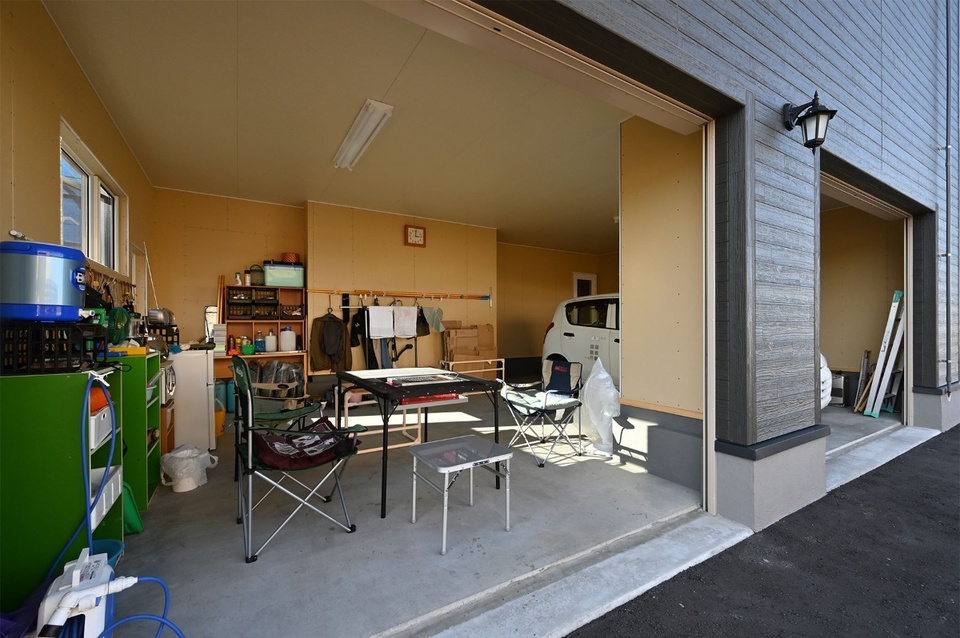 このほか、1階にある車2台分のインナーガレージは、移動に使う軽自動車を1台停め、もう1台分のスペースにはアウトドア用品などを置く場に。シャッターを開けてバーベキューを楽しむこともあるそうです。