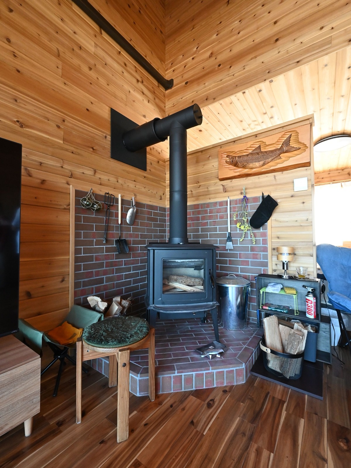 室内は壁と天井をウエスタンレッドシダー(米杉)、床を高級感ある茶褐色のアカシア無垢フローリングでコーディネートして木の温もりを感じられる空間に。「床のフローリングは、柔らかく、素足で歩いても暖かさが伝わるような木を選んでもらいました」と鈴木さん。特にインテリアとしても映える薪ストーブを設置したリビング・ダイニングは、森の中で焚き火をしながら大きな窓に映るオホーツク海に癒される雰囲気に浸れそう。