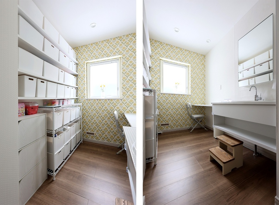 見せる収納で使いやすく整理。真ん中の壁で仕切れば二部屋に。ドアも二つ取り付けられています。