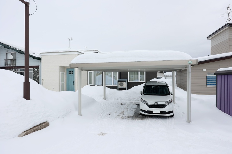 冬の降雪に備え、建物前には2台の車が収まるカーポートを付けました。お友達を招く時は、「水色の玄関扉の平屋建て」と伝えれば迷いません。