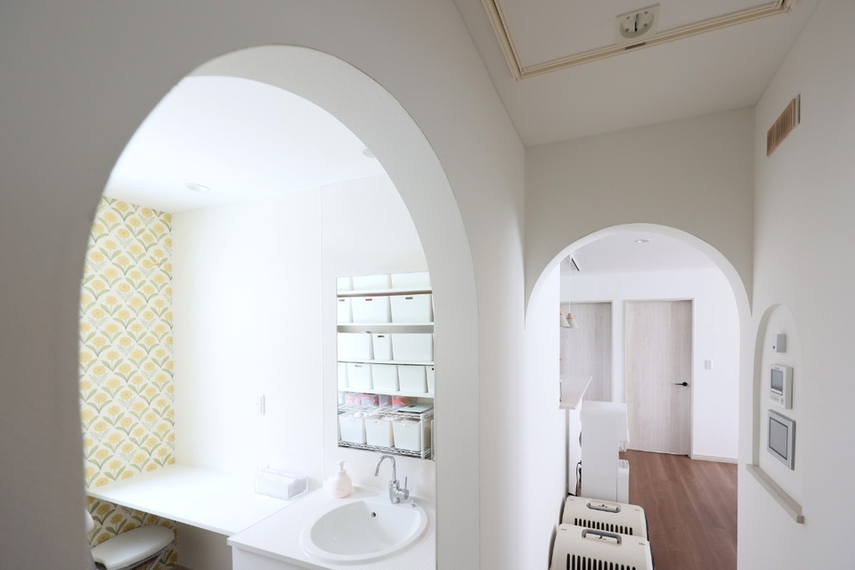 連続するアーチで美しく彩られた廊下。アール状の下がり壁や、イエローのアクセントクロスが、奥さまこだわりのプライベートな空間にかわいらしさを添えています。