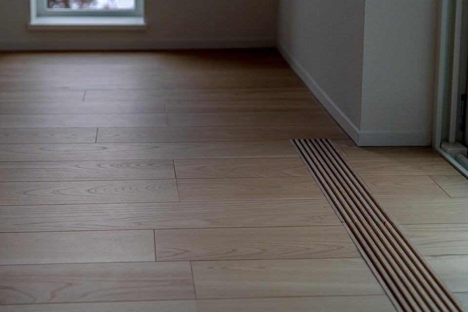 Iさん 室内に暖房機がなく、エアコン一台で家全体を暖められるというのも良かったですし、床材は幅広の突き板を選んだのも、ガラリの部材を樹脂ではなく木製にしてもらったのもすごく気に入っています。