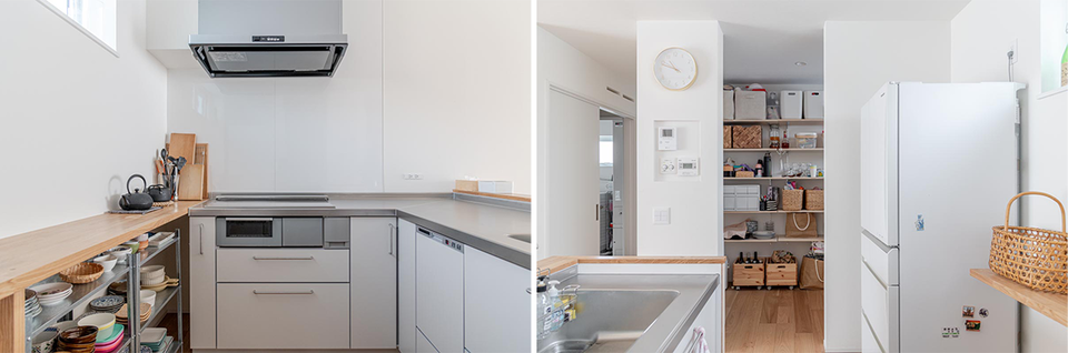 造作の食器棚も加えコの字型のキッチンに。食品庫も別途設け収納力を強化しました。
