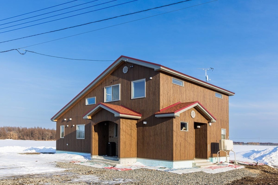 広々とした土地によく似合う大きな三角屋根の外観。設計・施工は池田町と帯広市に事務所をもつ赤坂建設(担当:高山辰也さん)です。