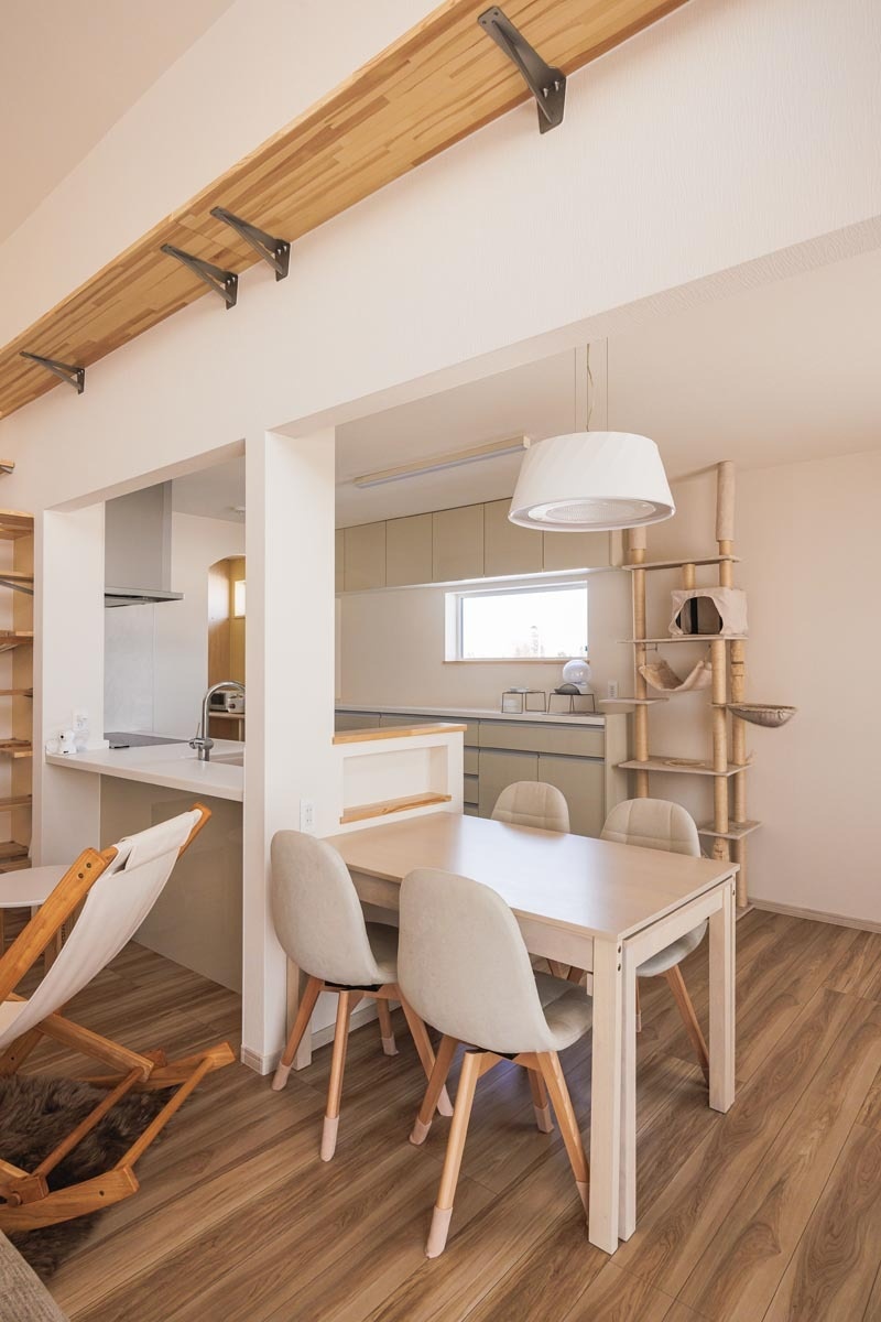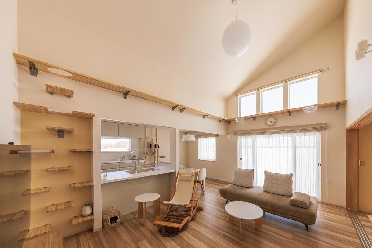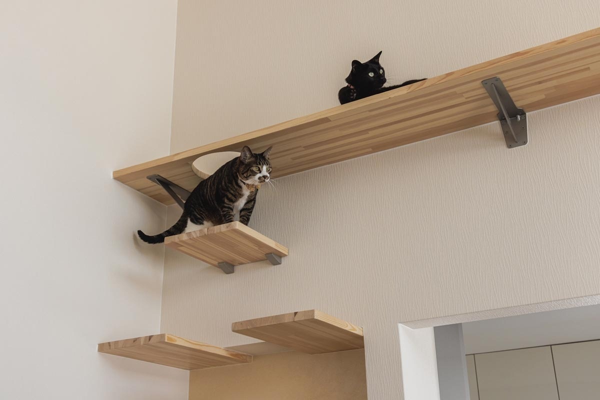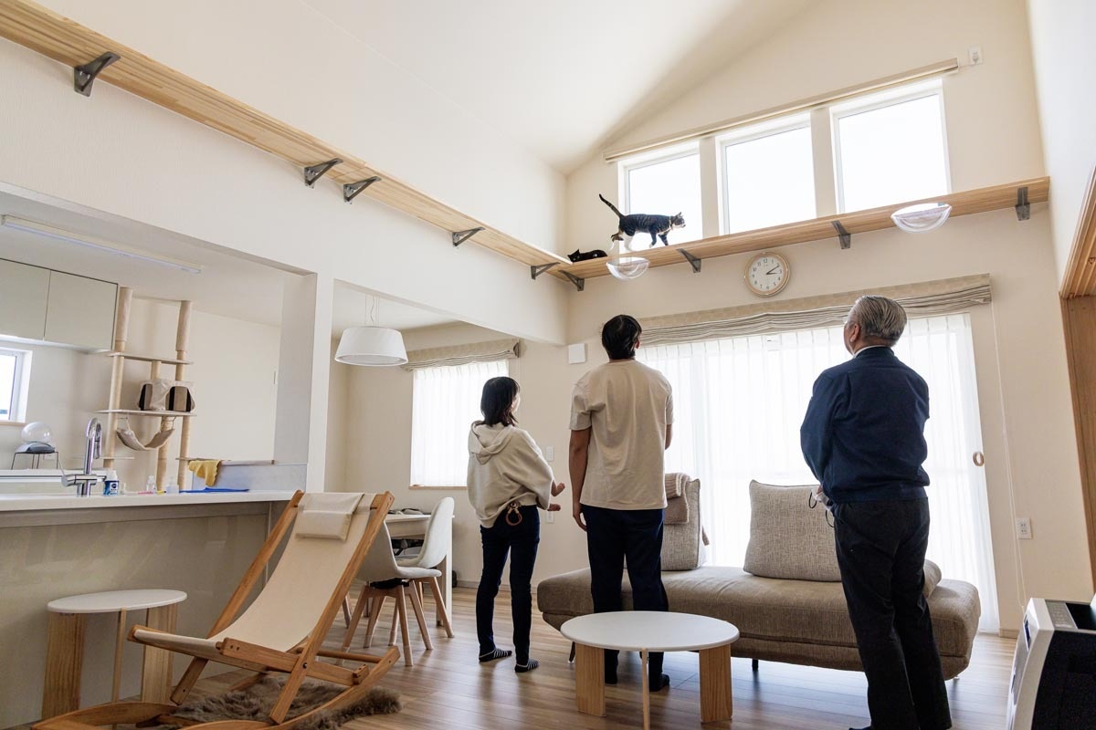 吹き抜けのLDKにはキャットウォークが。2匹ですれ違えるように幅は広く設計しました。