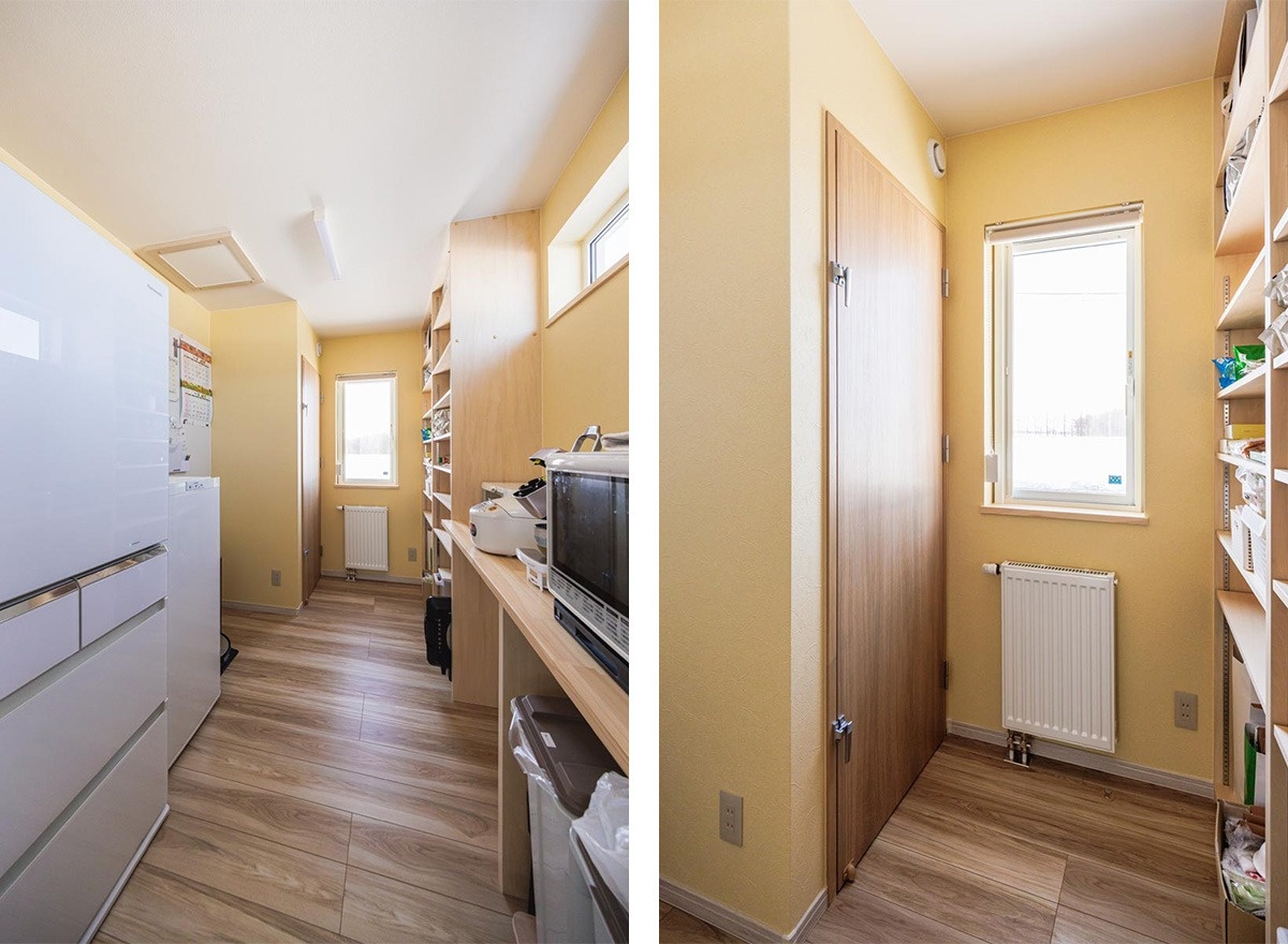 (写真左)キッチンをすっきりと保てるよう、冷蔵庫、冷凍庫、調理器具やダストボックスなどはすべてパントリーに収めました。
