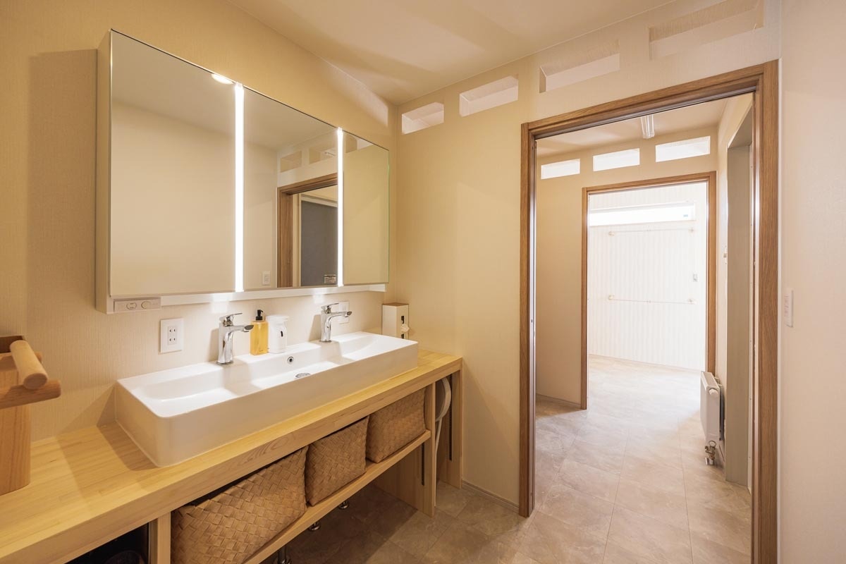 洗面、脱衣、風呂場へは、LDKを通らずに勝手口から直接行ける間取り。洗面台には蛇口を2つ取り付け、並んで使えるようになっています。