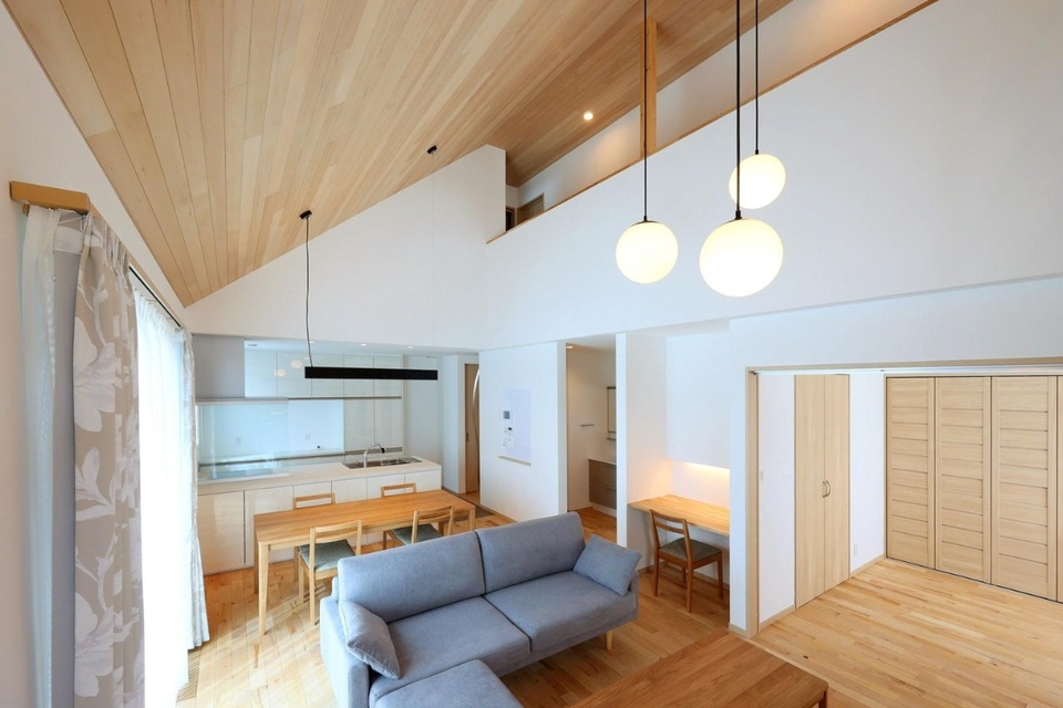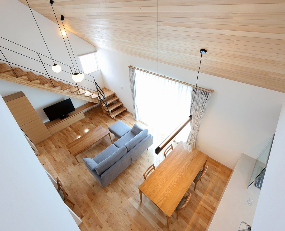 太陽光発電を搭載した傾斜屋根を生かして、リビング・ダイニングと2階をつなぐ大きな吹き抜けが生まれました。