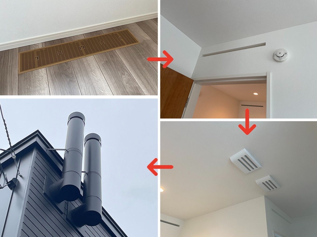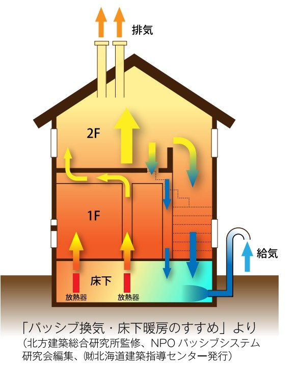 給気口から取り込まれた冷たい空気は、床下に設置された床下暖房で暖められ、暖められた空気は、壁の通気口やガラリを通って循環し、最後に排気筒から排出されます。