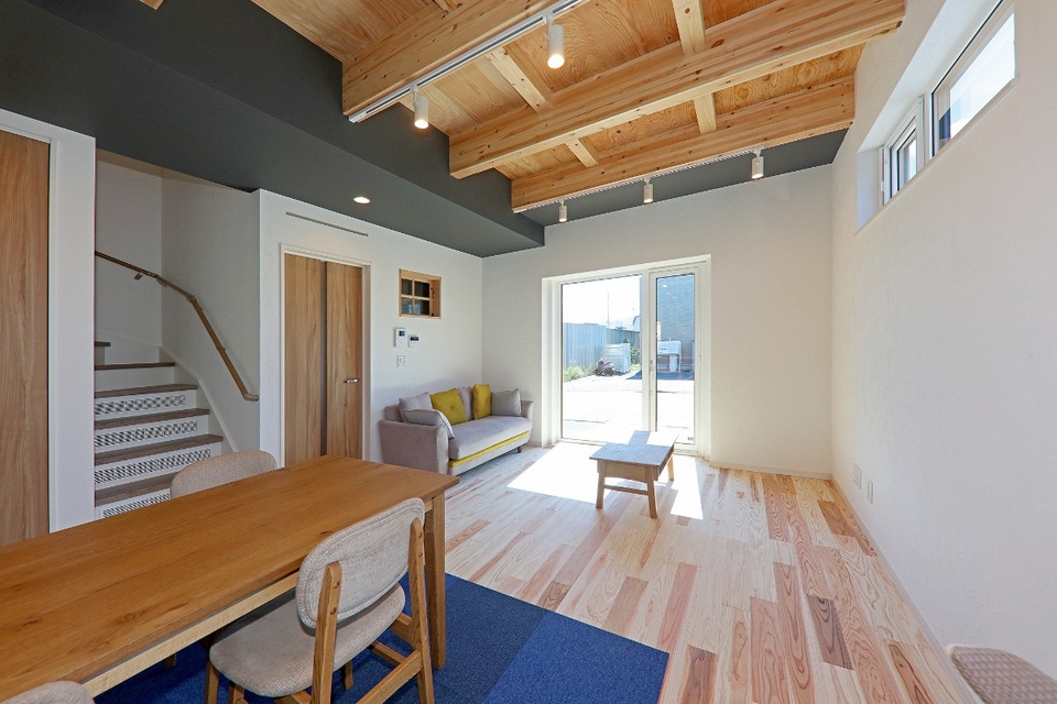 リビングは梁と2階の床下地合板を現しにした高天井。2.6mの高さがある開放的な空間です。床材には宮崎産のオビスギを使い、壁の一部は沖縄産のサンゴを材料にした塗り壁で仕上げています。