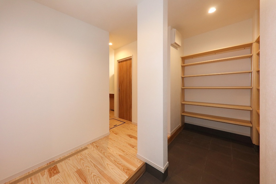 扉を開けた瞬間に木の香りが広がる玄関。土間続きにシューズクローゼットが確保されており、家族玄関にもなっています。