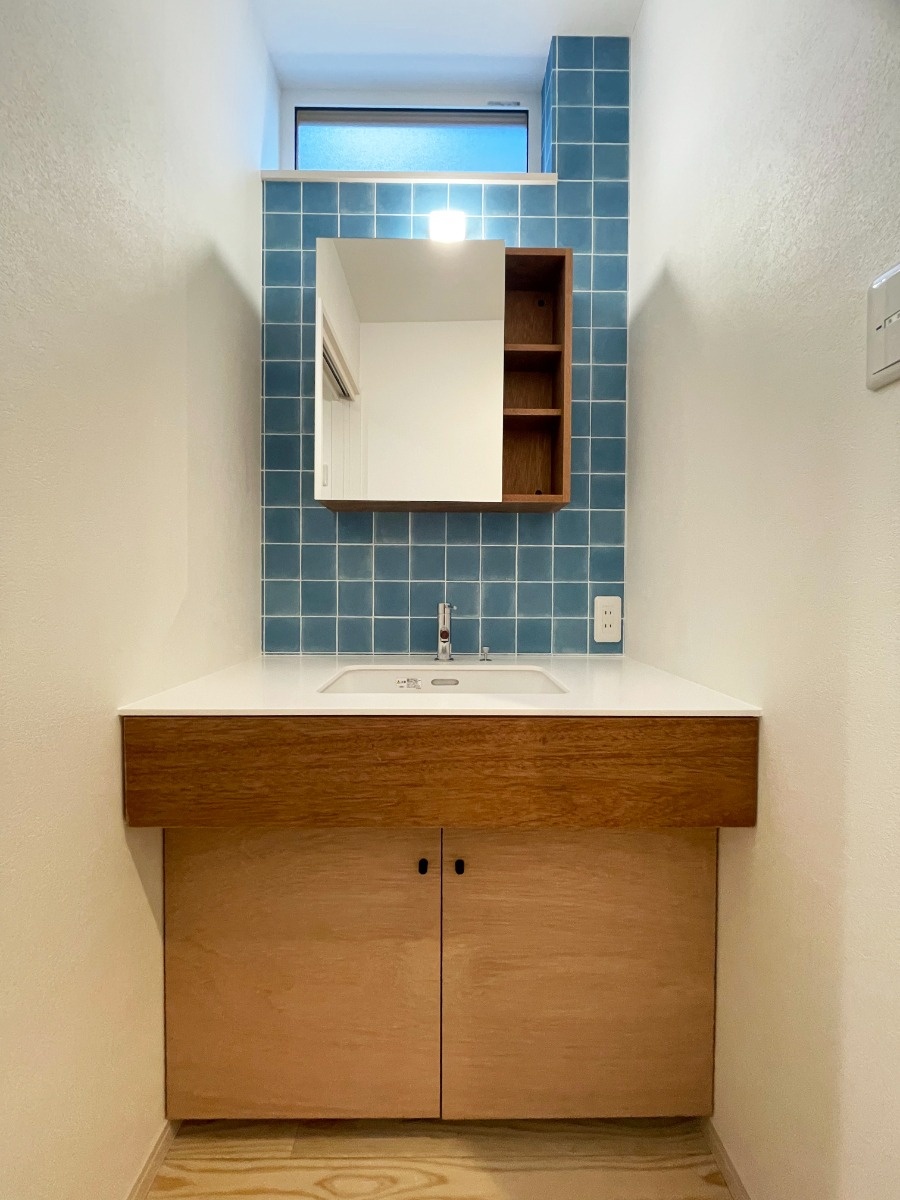 玄関ホールを右手に進むとすぐのところに洗面室があります。帰ってすぐに手洗いができる動線。ブルーのタイル柄の壁紙も素敵です。