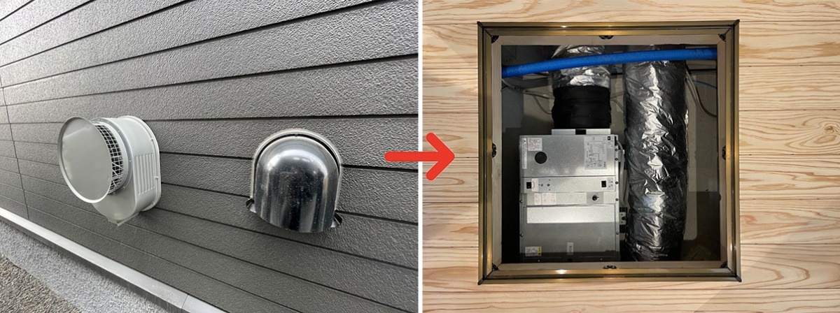 樽川モデルハウスでは、外気温に応じてパッシブ換気と第2種換気の切り替えができる、「ハイブリッド換気」を採用。床下に配置した専用モーターが給気口から取り込んだ外の空気を定温室に送り込み、定温室では室内に送る空気の温度や量が調整される仕組みです。
