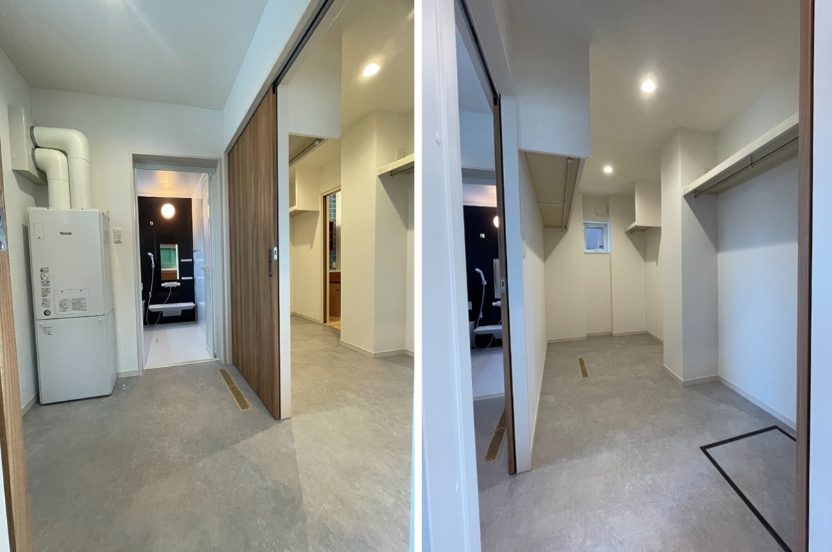 洗面室をさらに奥に進むと家族分の衣類が収まるファミリークローゼットがあります。ユーティリティーと引き戸で繋がっていており、洗濯後の収納や着替えもスムーズ。LDKにも出られる回遊動線になっています。床下暖房で冬も暖かいので、入浴や着替えの際も快適です。