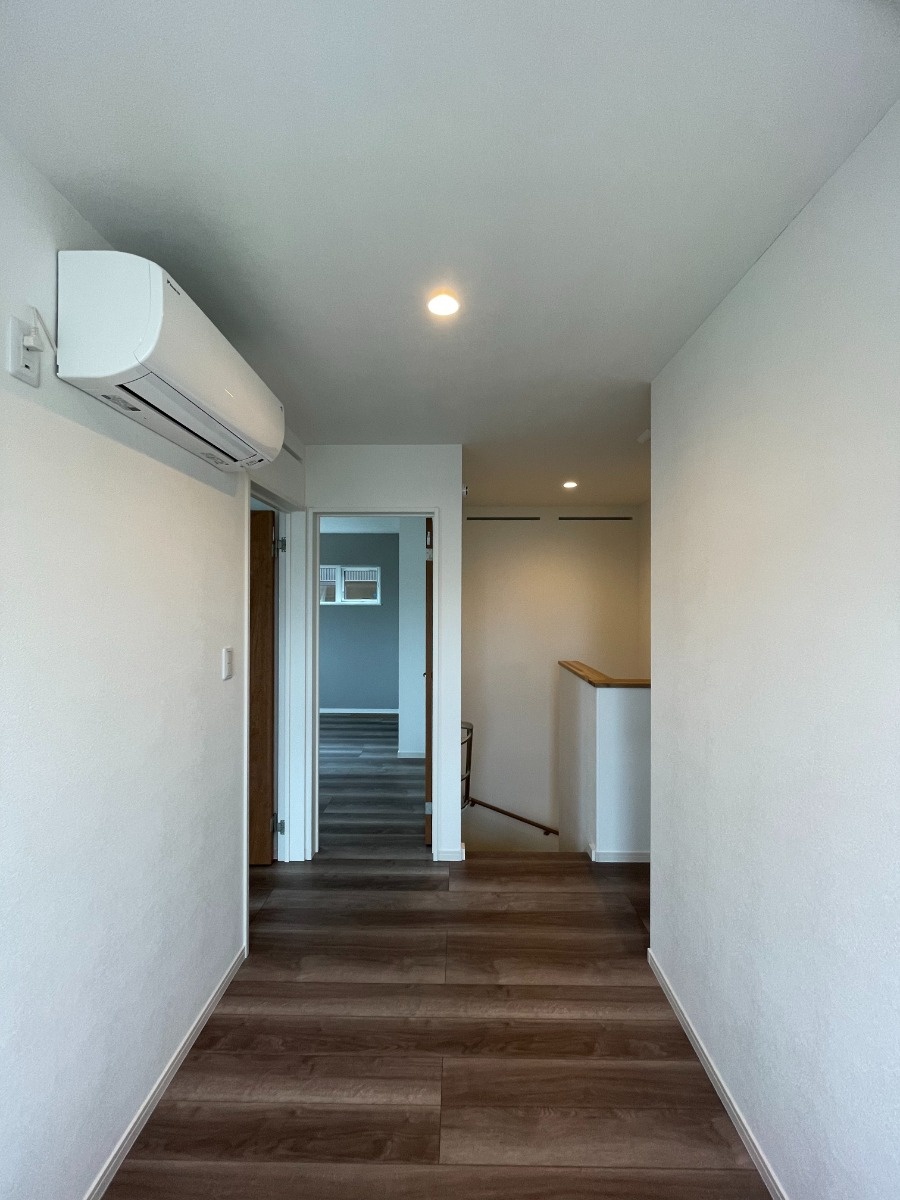 階段を上がりきると、正面にエアコンが設置されたフリースペースがあります。階段を伝って冷気が下がり、夏場はこのエアコン1台で家中を涼しく保つことができます。