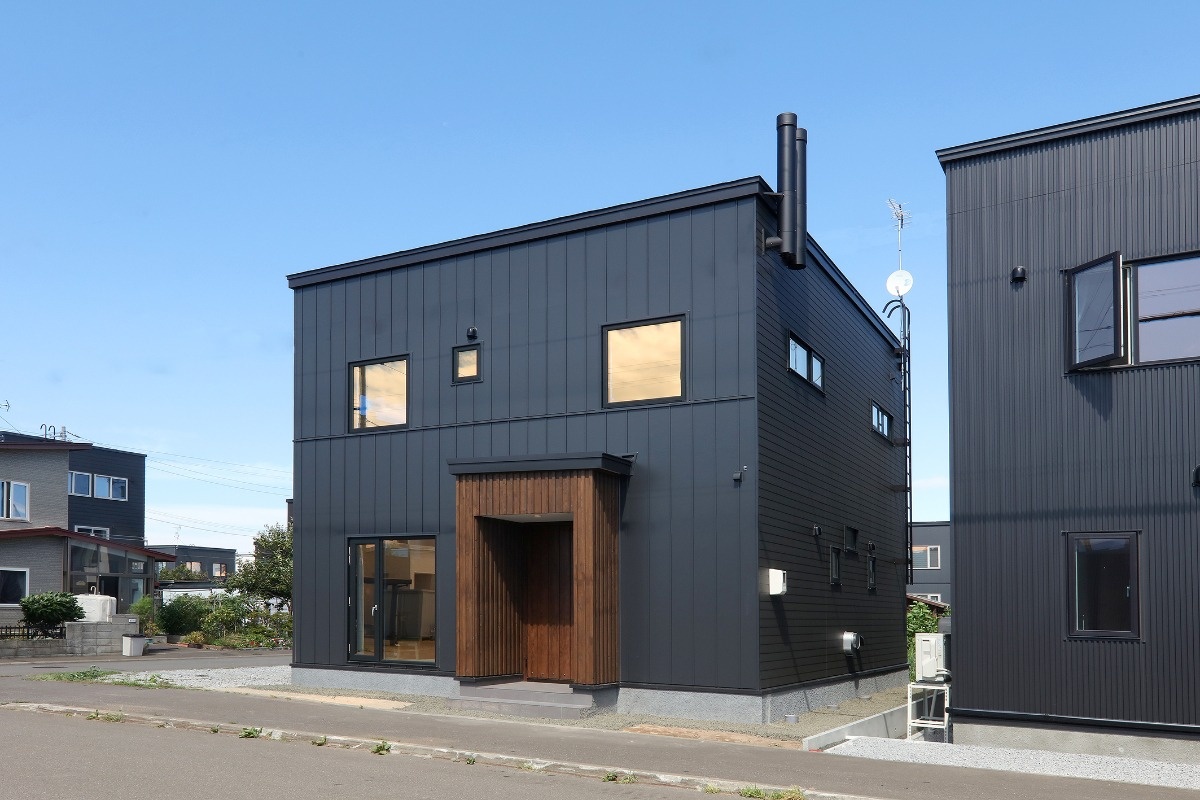 ブラックのガルバリウムがスタイリッシュな外観。玄関まわりに添えた木のあしらいが温もりを添えています。2本の煙突のようなものはパッシブ換気の排気筒です。
