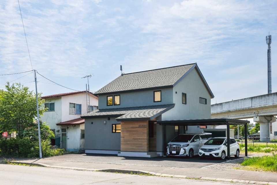 外観はグレーの外壁に木を使用したポーチが落ち着いた印象。外壁は漆喰です。「漆喰は割高なイメージでしたが、メンテナンスの頻度を考えるとコストパフォーマンスは悪くないと教えてもらって。気に入っています」