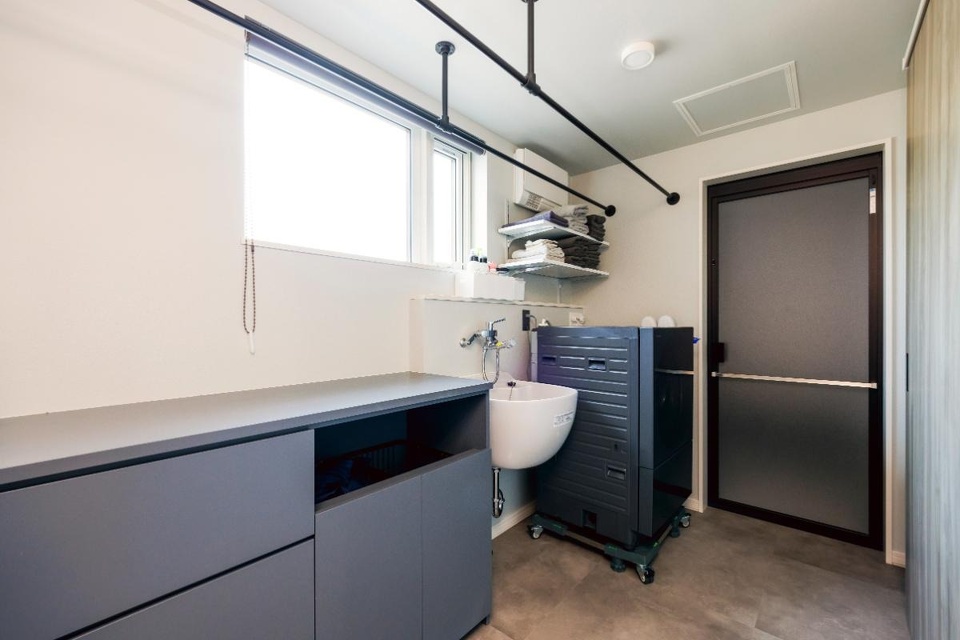 脱衣室には脱衣カゴが収まる造作の棚(写真中央)を設けました。