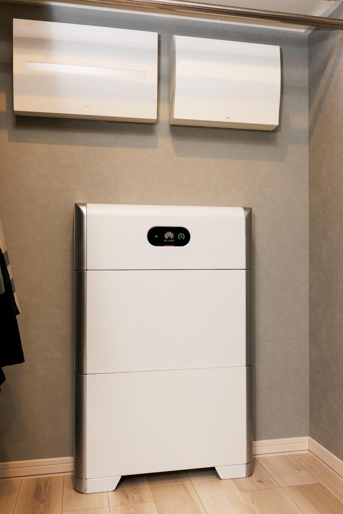 脱衣室の隣にあるファミリークローゼットの中に、なにやら機械のようなものが。パネルヒーターかと思うほどの薄さですが……。