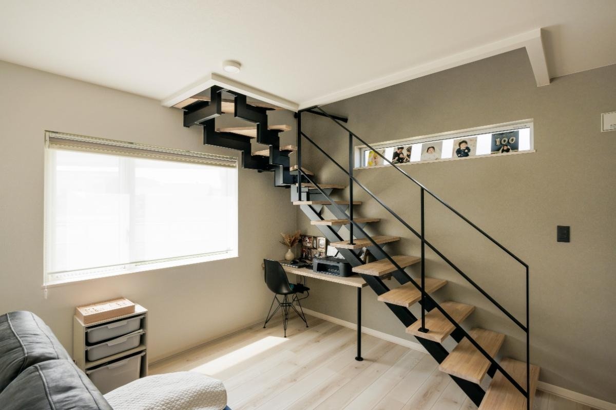 インテリアは、「落ち着きがありつつも暗くはならないように」と色や素材をバランスよく配置。階段下はご夫婦共用のデスクスペースになっています。