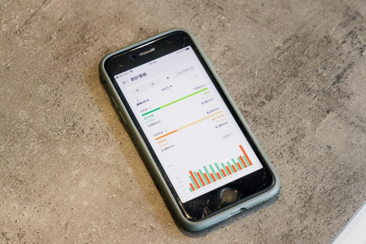 冬場は暖房の電力消費が大きいので発電量を消費量が上回りますが、それも3ヶ月間くらい。暖かくなってくる3月頃からは家で使う電気をほぼソーラーで賄えるようになり、夏場は売電による利益が出ています。発電量のチェックは専用の液晶機器などが必要なく、スマホで確認できるので便利です。
