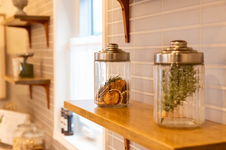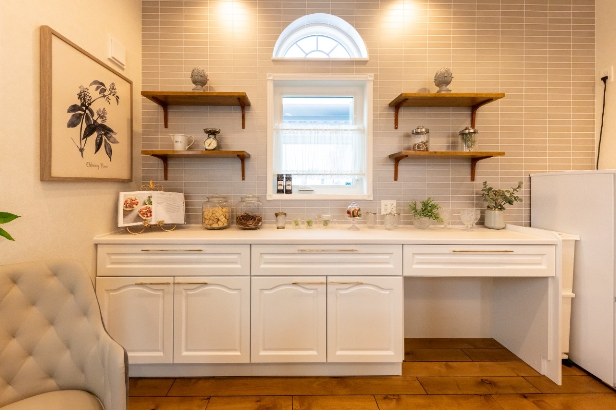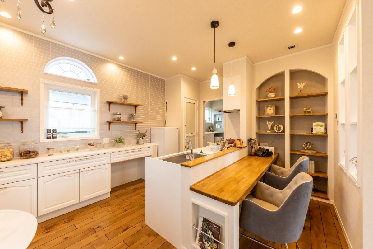 カウンターテーブルの付いた対面キッチン。リビングとは飾り棚を配したパーテーションで仕切られており、カフェやバーのように居心地のよい空間です。