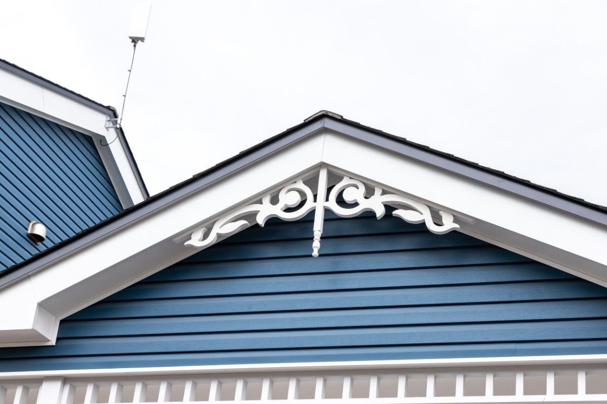 こちらはガレージの三角屋根にあしらった妻飾り。こうした輸入住宅らしい演出が随所に光ります。