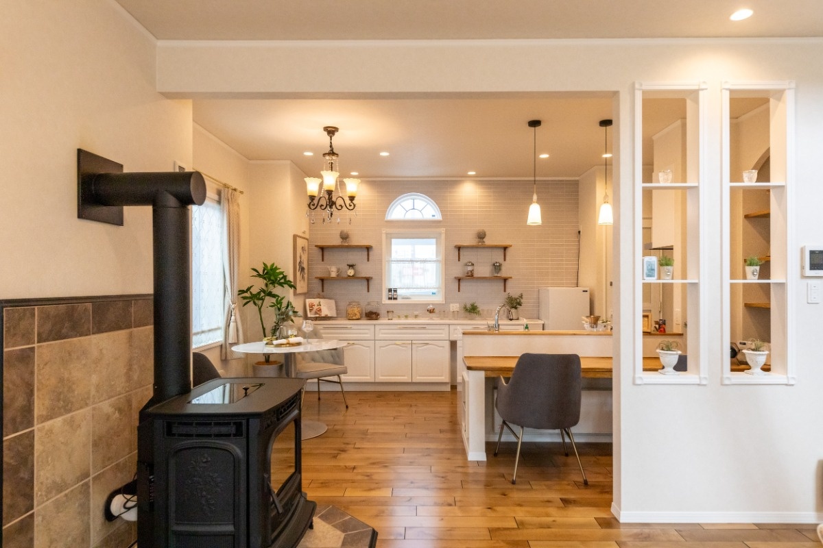 リビングと緩やかにつながるダイニング・キッチン。手前に置かれたペレットストーブが良い雰囲気です。