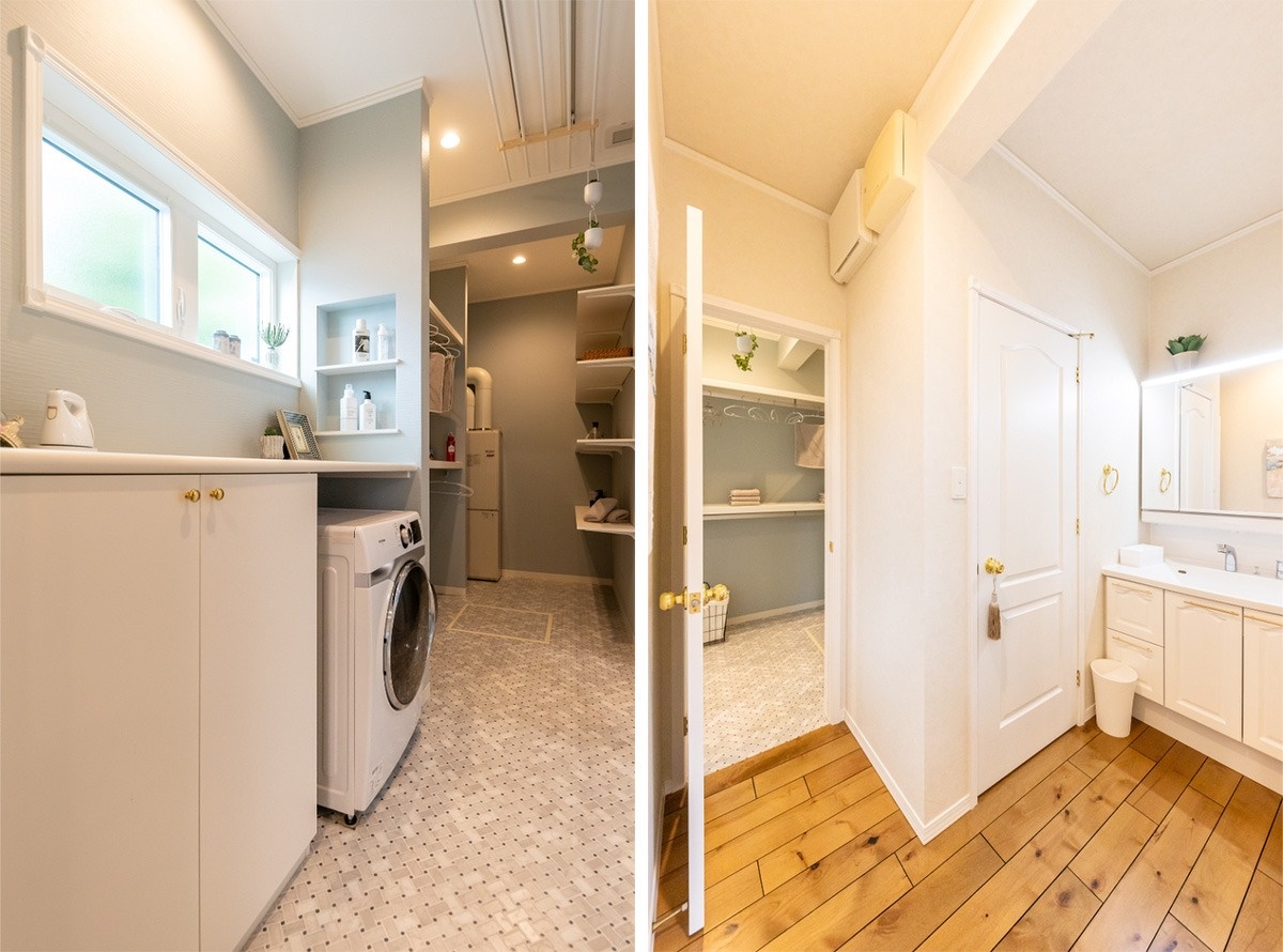 左/キッチンと横並びのユーティリティーは、作業カウンターや可動式の電動物干しが付いたゆとりの設計。収納も豊富に備えています。
