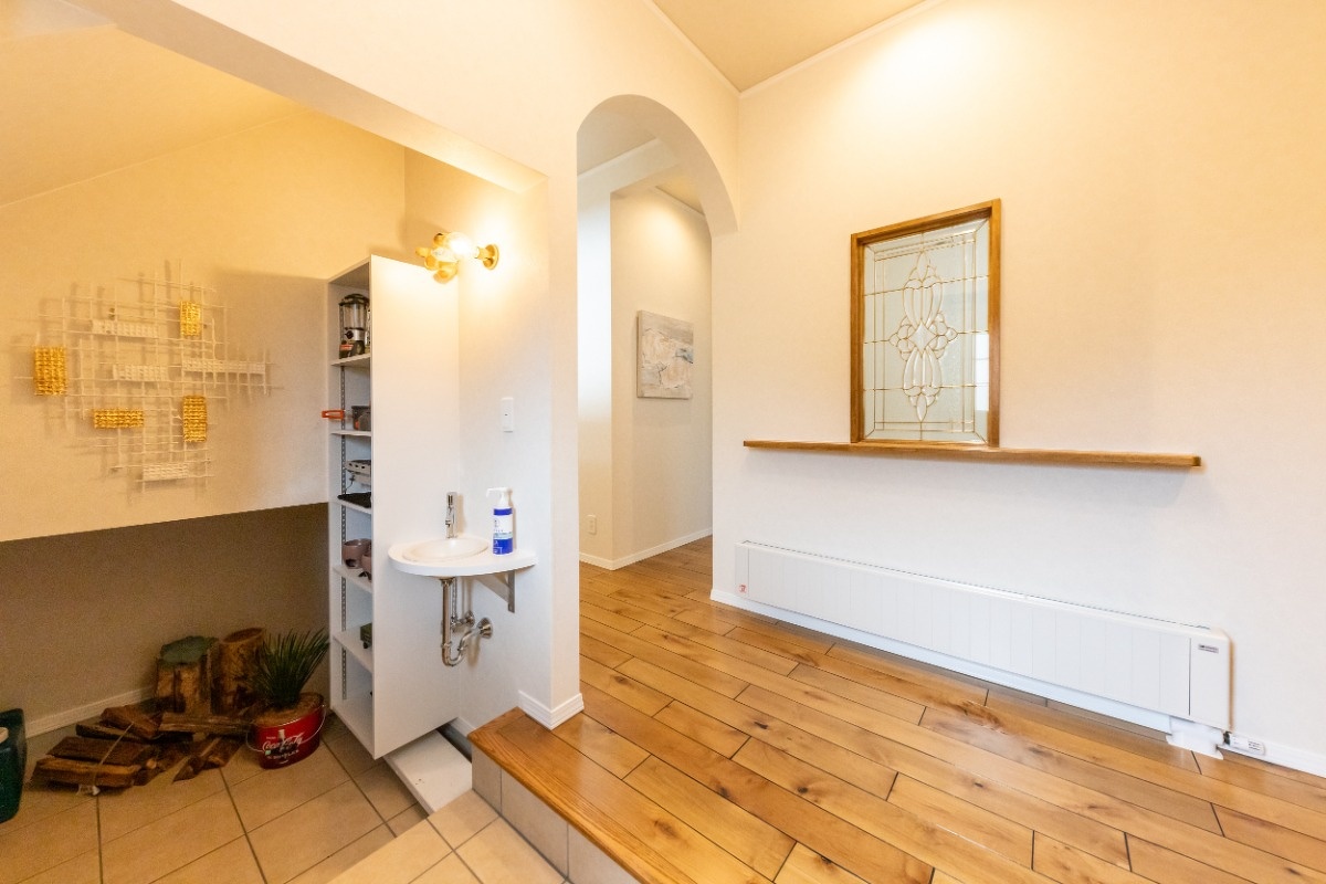 玄関ホールには現代風にアレンジしたステンドグラスやアールの下がり壁を採用。ホールに上がる前に手洗いが済ませるよう、手洗いボールを備えています。