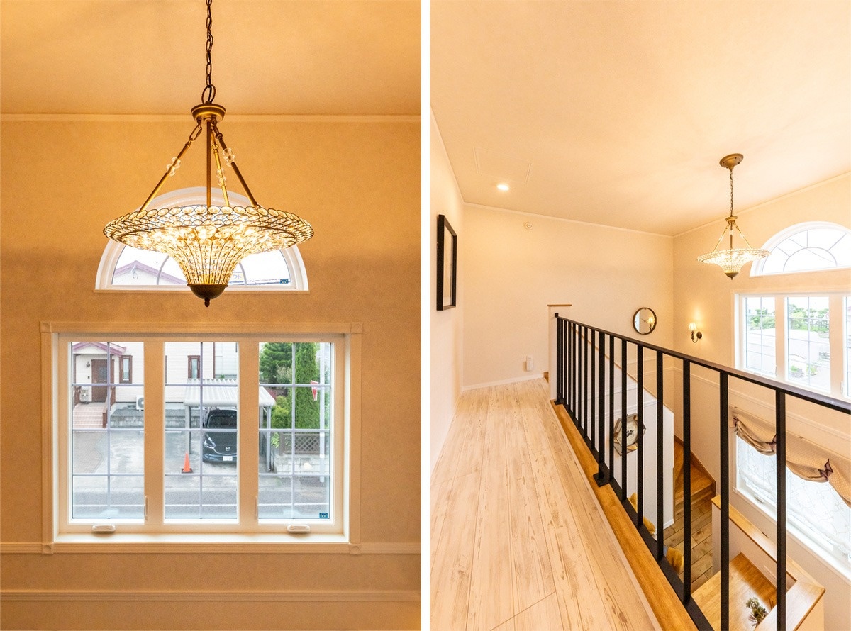 吹抜の2階ホール。瀟洒なシャンデリア、3連の格子窓、ハーフラウンドの採光窓がおおらかな空間を彩ります。
