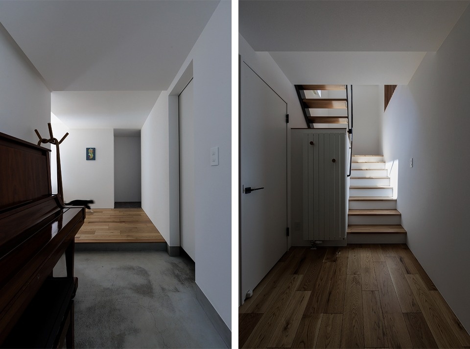 (写真左)広々とした玄関土間には家族の趣味だというピアノが置かれていました。漆喰調の白い壁とフローリングのナラ材がマッチしてお店や美術館のような雰囲気です。玄関土間右手の引き戸を開けると、シューズクローゼットがあります。