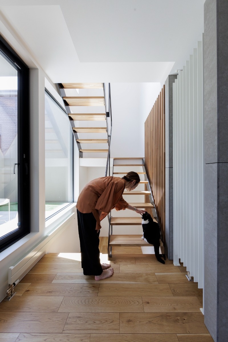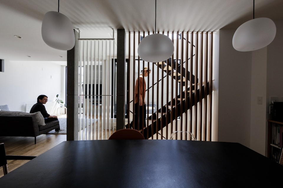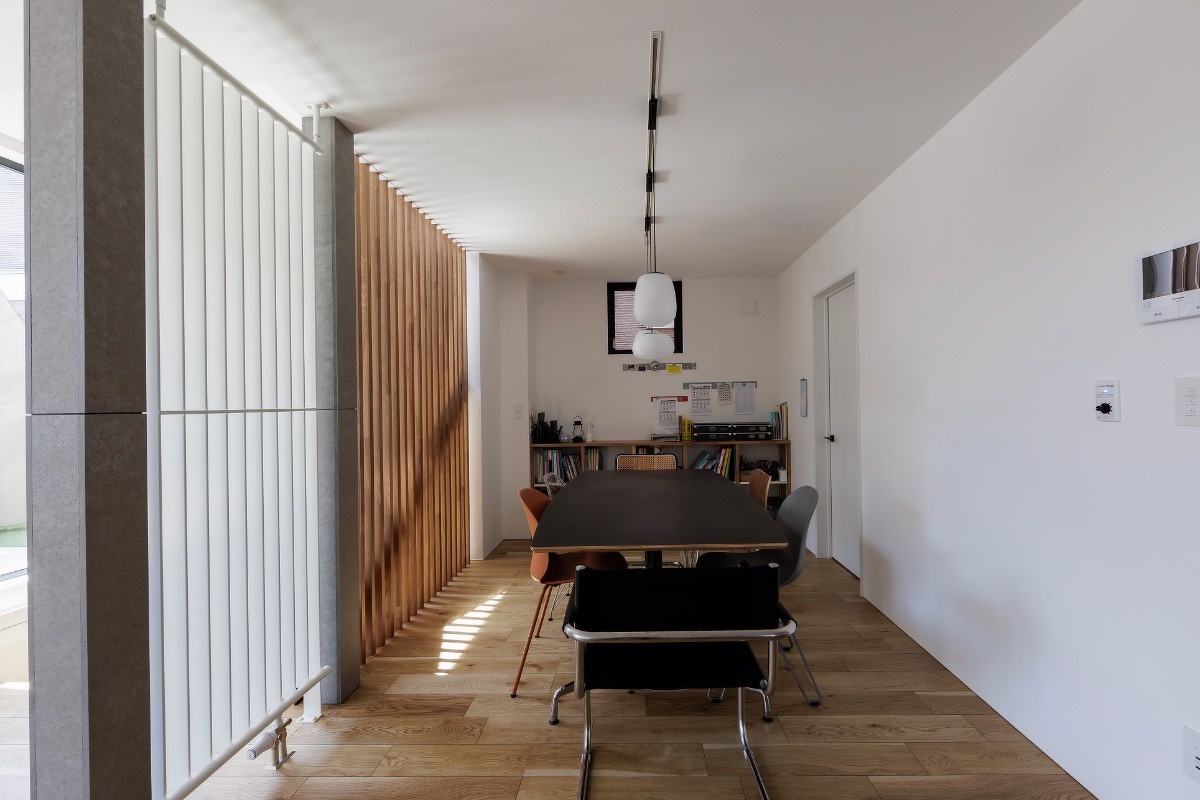 テラスから日差しが差し込むダイニング。木製ルーバーで緩やかに階段室と仕切られています。