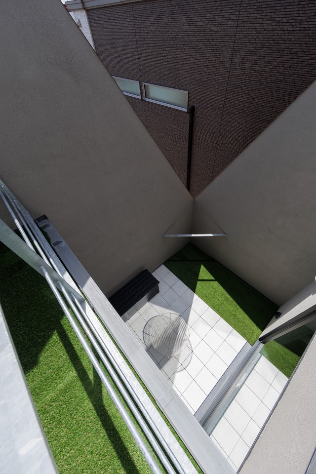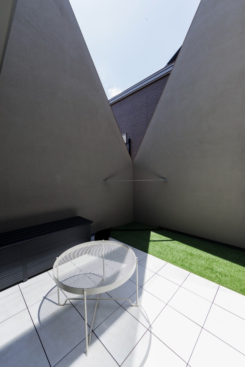家族のお気に入りスポットだという2階テラス。斜めにカットされた開口部からの採光で明るく、壁面が視線を遮るプライベートな空間になっています。「週末には家族でバーベキューを楽しんでいます」と奥さま。