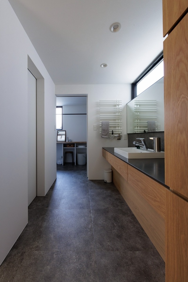 ダイニングから出入りができる洗面室にはドアが設置され、左手の引き戸の先にあるトイレからの音漏れを防ぐ役割を果たしています。
