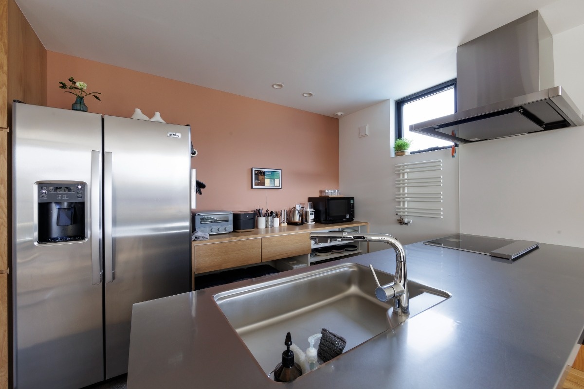 ご夫婦こだわりのキッチンは、タカラスタンダードのセミオーダーです。手入れが楽なステンレストップで家族6人分の食器を並べても十分な広さがあります。