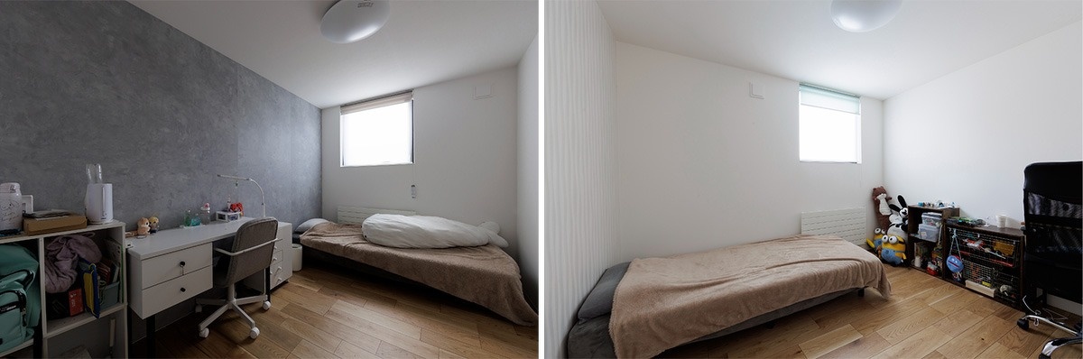 4部屋それぞれクロスの色が違う3階の居室。子供たちはリビングやプレイスペースで勉強やゲームをした後、プライベートな空間でそれぞれの時間を楽しんでいます。