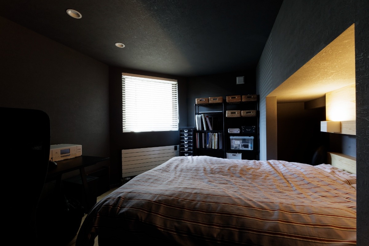 ご夫婦の寝室は、落ち着いた色合いのクロスとダウンライトでリラックスできる空間に。ベッドのヘッドボードは階段下のスペースに納められ、ベッド奥には季節家電をしまっておける空間があります。随所に限られた空間を有効に使う工夫が凝らされています。