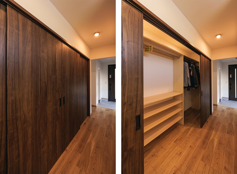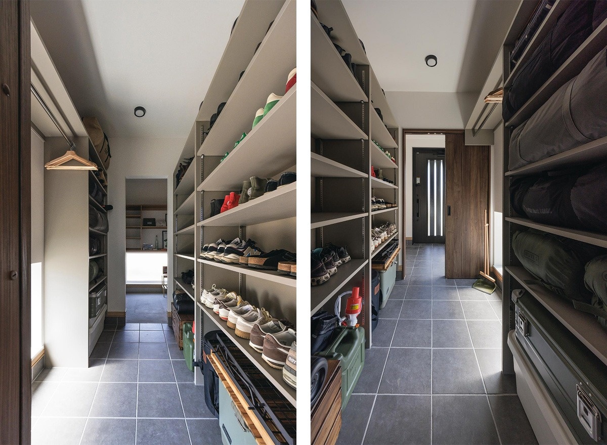 両玄関の間は大容量のシューズクロークで接続。キャンプ道具をしまったり、お気に入りの靴もひと目でわかります。どちらの玄関を使うときもサッと入れ、掃除もしやすい設計です。