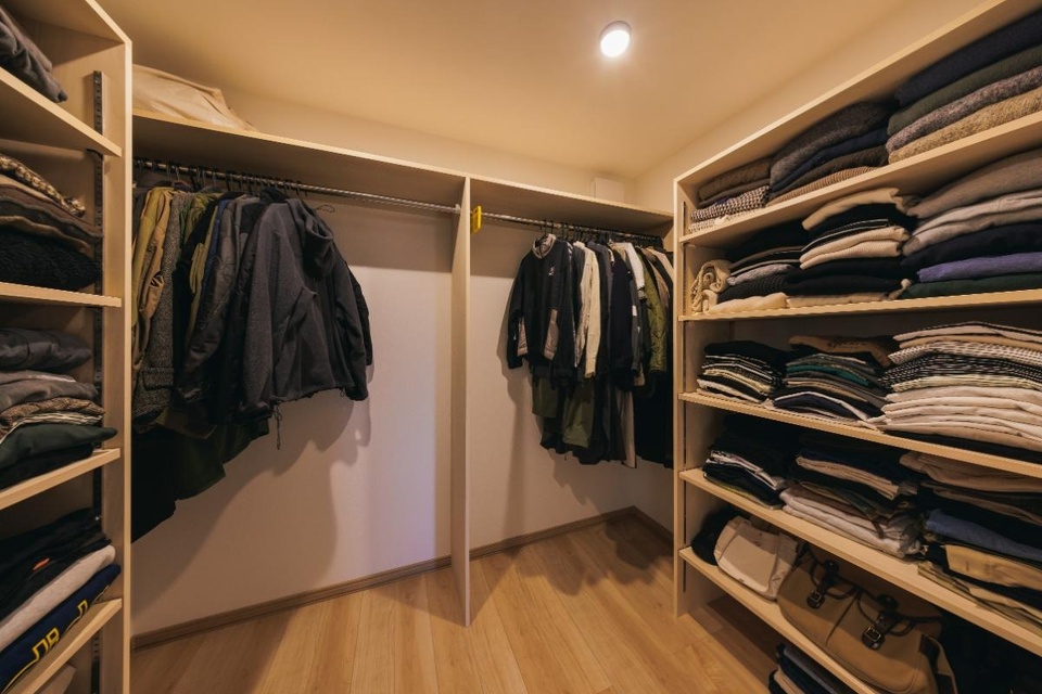 二階には部屋ごとではなくホールに大きなウォークインクローゼットを設置。管理のしやすい空間になりました。