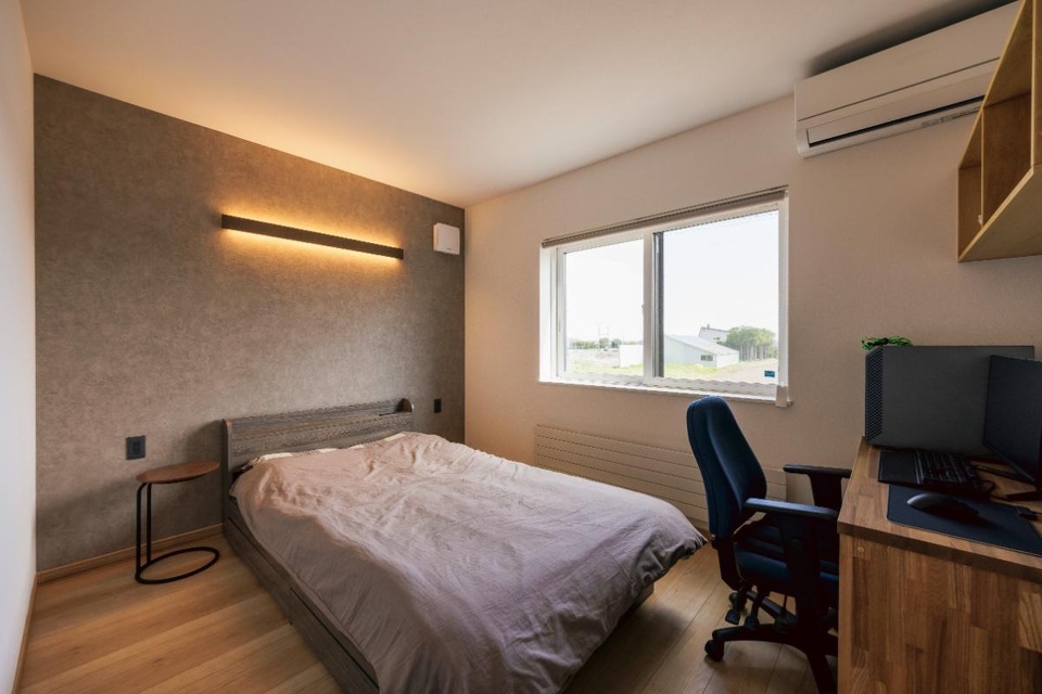 二階の寝室には、仕事用として使うカウンターと棚を造作しました。