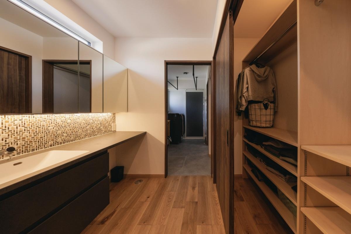 洗面所の収納はファミリークロークになっており、洗濯・乾燥した衣類を片付けやすい造り。