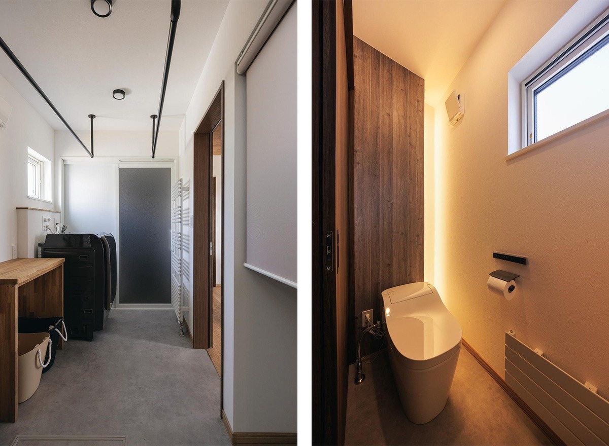 家事のしやすさを左右する水回りの間取りは、裏玄関から洗面所、脱衣所、風呂場へと一直線に設計されています。帰宅後の身体を素早く清潔にできる動線は、子育て世帯にも参考になりそうです。