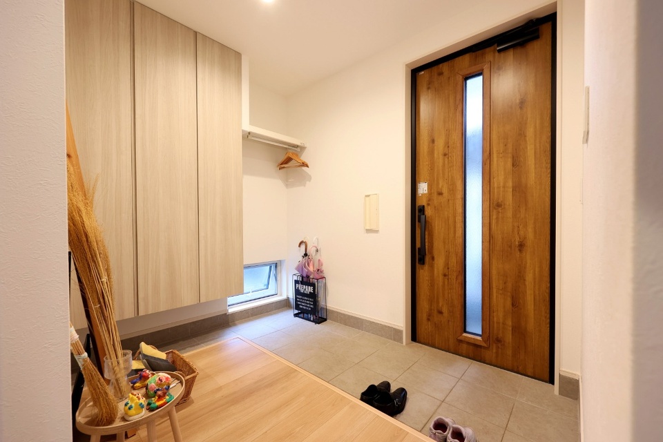 奥さま 土間収納に憧れがあって、最初は収納と玄関を分けられるような仕切り壁を設計に組み込んでもらっていました。現場見学をして実際の玄関を大工さんと一緒に見た時に、仕切り壁を設けると玄関を狭く感じるかもしれないという話になって、大工さんが壁をつけずに広さを生かす方法もあるよと提案してくださいました。実際に暮らしてみると使いやすくて、大工さんの提案通りにして良かったと感謝しています。